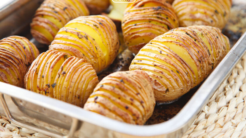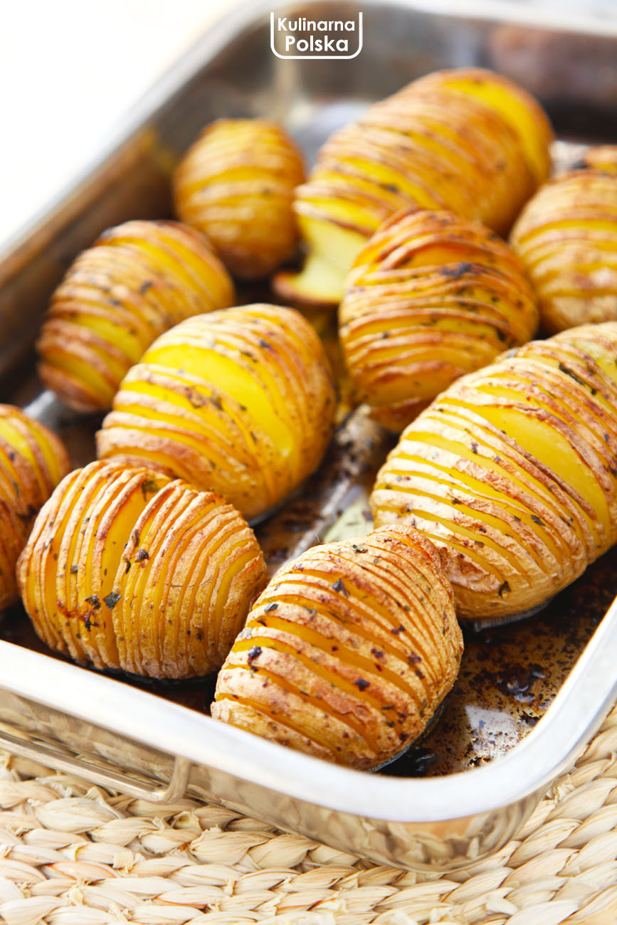 Zrób tak: cały sekret polega na specjalnym nacięciu każdego kartofla. Wbrew pozorom wcale nie jest to takie trudne. Wystarczy każdy ziemniak przyłożyć do deski (grubość około 1 cm) i cienko nacinać do momentu aż nóż napotka krawędź. Jest to troszkę pracochłonne, ale gdy nabierzecie wprawy, idzie bardzo szybko. W rondelku rozpuszczamy masło i mieszamy z oliwą w proporcji pół na pół – samo masło mogłoby przypalić się w wysokiej temperaturze. W wersji wegańskiej wystarczy oliwa. Ziemniaki doprawiamy, następnie obtaczamy w tłuszczu, starając się dotrzeć pomiędzy płatki. Pieczemy w temp. 180 stopni przez godzinę, w połowie włączając termoobieg.
