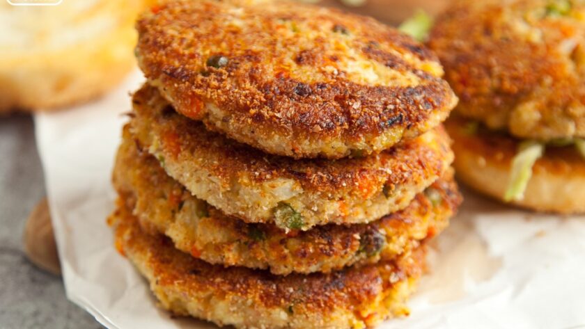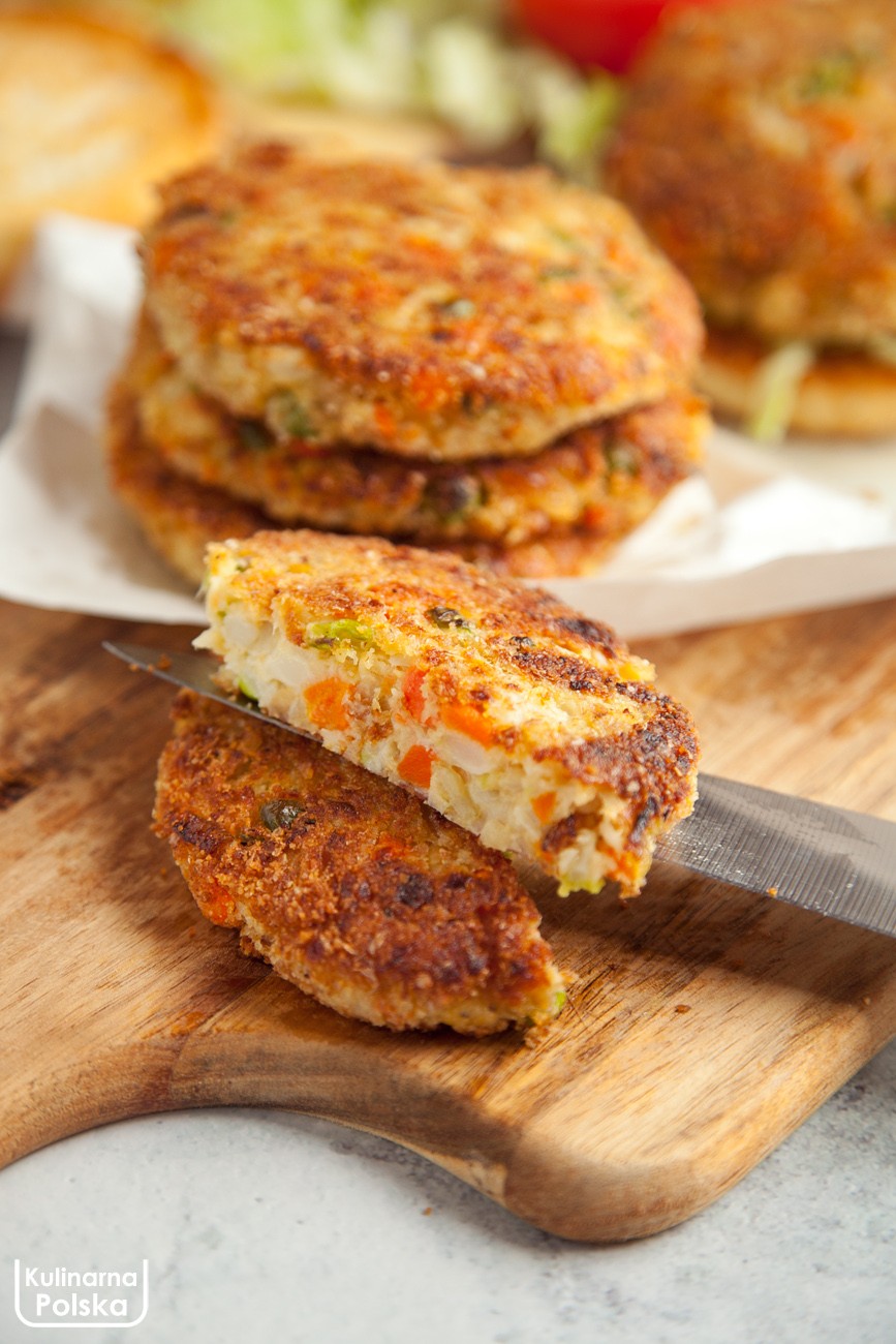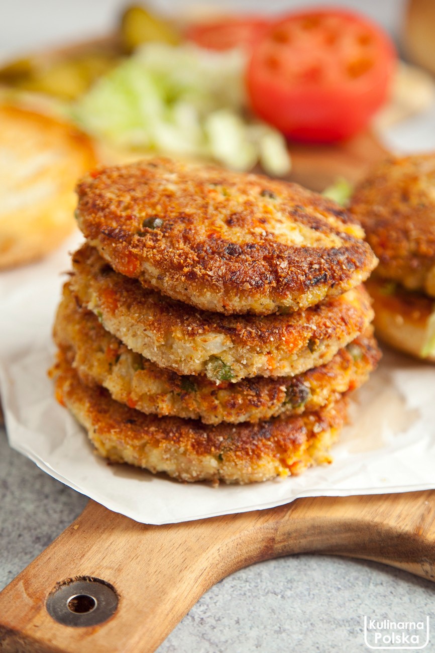 - Z masy formuj kule, każdą obtocz w mieszance bułki tartej i otrębów, spłaszcz formując burgery, następnie smaż na oleju przez około 3 minuty z każdej strony – uwaga przy przewracaniu i zdejmowaniu, kotlety są dość delikatne.