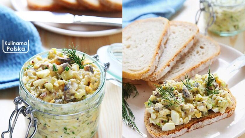 Składniki: 5 wymoczonych płatów śledziowych, trzy jajka ugotowane na twardo, dwa ogórki kiszone, średnia cebula, czubata łyżka musztardy, łyżka śmietany lub mniej tradycyjnie – majonezu, grubo mielony pieprz, świeży koperek.