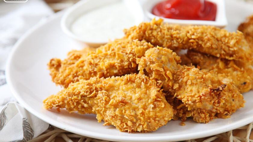 Zrób tak: piersi z kurczaka pokrój w cienkie paski, przełóż do miski, dodaj jogurt, czosnek roztarty z solą na papkę, sól i pieprz, dokładnie wymieszaj i odstaw co najmniej na 3 godziny, a najlepiej na noc, aby mięso się zamarynowało. Dzięki temu będzie miękkie, soczyste i aromatyczne. Gdy już się zamarynuje, do miski wbij jajka i ponownie wszystko wymieszaj. Płatki kukurydziane rozgnieć – najłatwiej zrobić to, wysypując je na dużą deskę i traktując wałkiem do ciasta. Każdy kawałek panieruj w płatkach i układaj na blaszce. Piecz około 30 min. w temperaturze 180 stopni. Pod koniec można włączyć termoobieg.