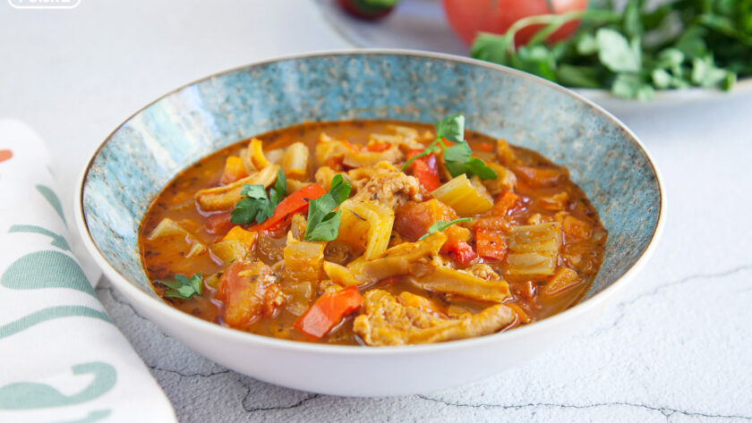 Składniki: 500 gramów oczyszczonych i pokrojonych żołądków wołowych, 2 cebule, 2-3 marchewki, 1 papryka czerwona, seler naciowy, puszka pomidorów w zalewie, 3 ząbki czosnku, szklanka białego wina (opcjonalnie), łyżka papryki w proszku, oregano, liście laurowe, sól, pieprz, oliwa lub olej.