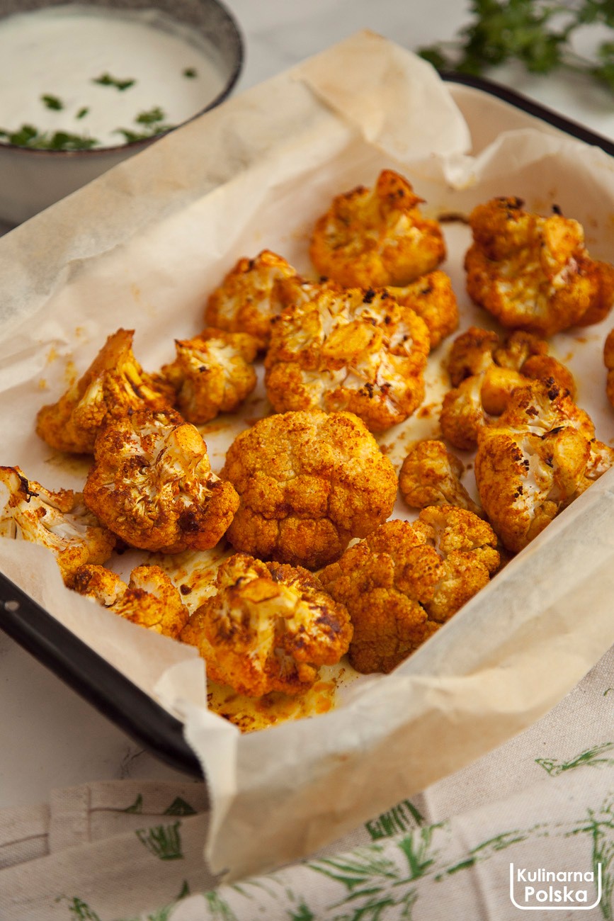 Podaliśmy go z sosem jogurtowym jako warzywną przekąskę, ale równie dobrze sprawdzi się w roli dodatku do innych dań. Dzięki wyrazistej mieszance przypraw i krótkiemu marynowaniu tak przyrządzony kalafior jest niesamowicie smaczny.