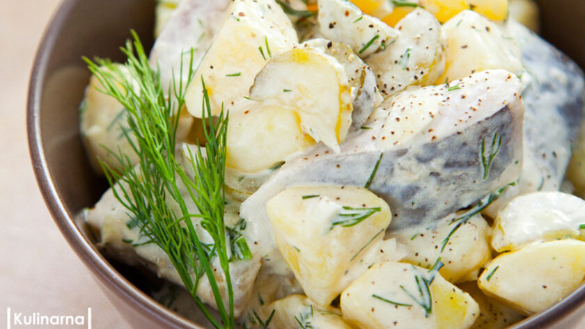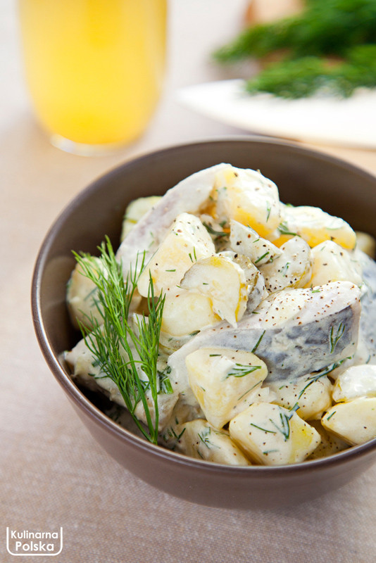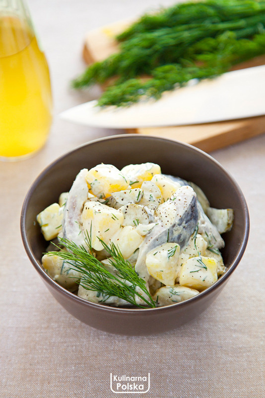 Składniki: 400 gramów wymoczonych matiasów, 4 średnie ziemniaki, cebula, 2 ogórki konserwowe, ocet jabłkowy, kopiasta łyżka majonezu, pieprz, świeży koperek.