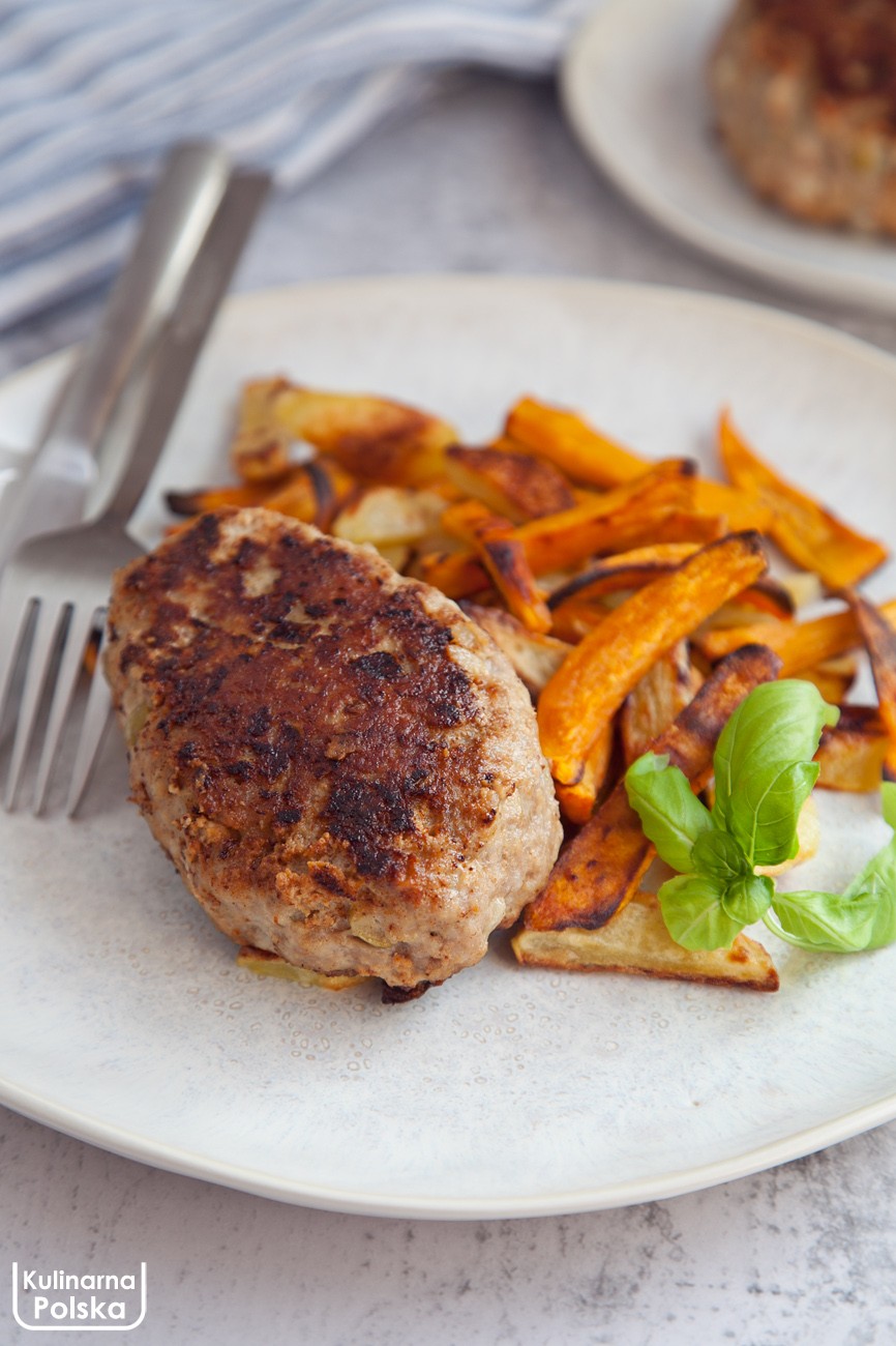 Rada: kotlety podaliśmy z batatami i ziemniakami, które pokroiliśmy w słupki jak na frytki, natarliśmy odrobiną oleju i piekliśmy przez około 25 minut w temperaturze 190 stopni.
