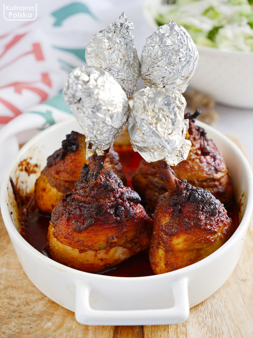 Zrób tak: najpierw trzeba obrobić podudzia. Każde z nich natnij do kości w miejscu, gdzie końcówka zaczyna się rozszerzać. Następnie ściągnij skórę w dół, odsłaniając kostkę, w drugiej części zaś uformuj kulę z mięsa owiniętą skórką. W misce wymieszaj dokładnie składniki marynaty. Natrzyj nią kurczaka i odstaw do lodówki na kilka godzin, aby się zamarynował. Przed pieczeniem owiń końcówkę kostki folią aluminiową. Piecz w pozycji pionowej w temperaturze 200 stopni przez około 25-30 minut.