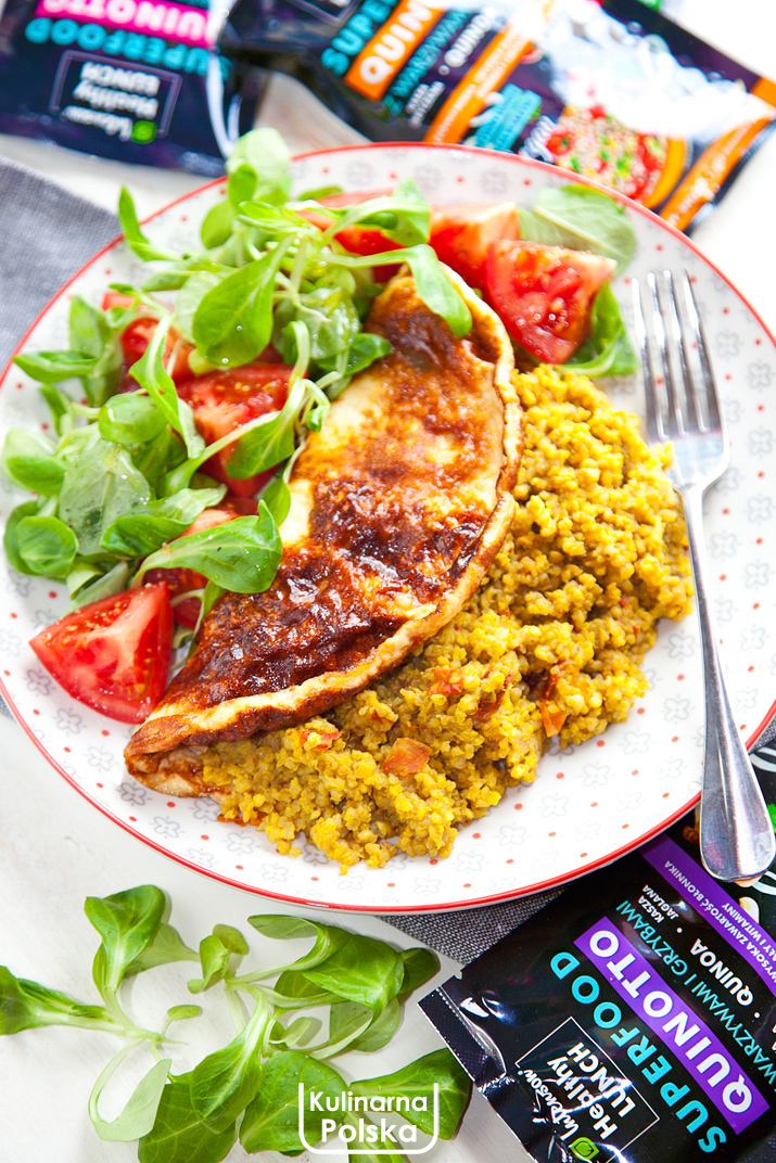 - Omlet przełóż na talerz, na jedną połowę wyłóż quinotoo i przykryj drugą.