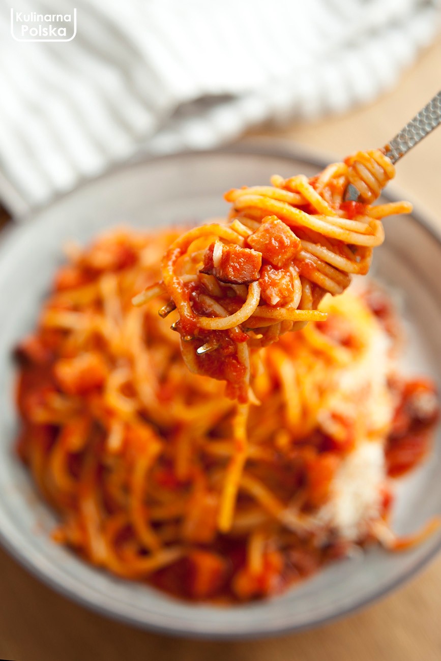 Wspominaliśmy nasz wypad do Rzymu i oczywiście przysmaki, które wtedy jedliśmy. Świetna była pasta all’Amatriciana w małej restauracyjce przy fontannie di Trevi. Poszperałem w poszukiwaniu autentycznego przepisu. To jedno z klasycznych włoskich, ale też właśnie rzymskich dań. Sos wyszedł przepyszny.