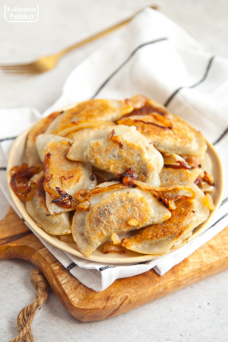 - Pierogi są gotowe po wyjęciu z wody. Z tym farszem najlepsze są jednak po zrumienieniu na niewielkiej ilości oleju (smażone przez 2-3 minuty z każdej strony), podane z odłożoną wcześniej cebulką.