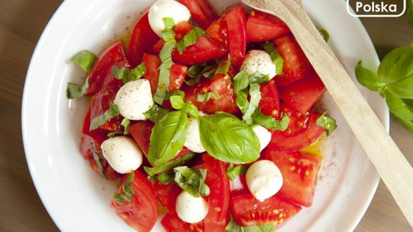 Z dobrymi pomidorami nie warto jakoś specjalnie wydziwiać. Są pyszne już z odrobiną soli i oliwy. Bardzo lubimy połączenie z klasycznej włoskiej sałatki caprese. Tradycyjnie plastry pomidorów układa się w niej na przemian z mozzarellą, jednak nic nie stoi na przeszkodzie, by po prostu wymieszać składniki w każdej sałatce. Tak właśnie zrobiliśmy tym razem. Nieodzownymi składnikami caprese jest także oliwa, świeża bazylia i świeżo zmielony pieprz. Wszystko po prostu delikatnie wymieszaj. Wiwat pomidory! 🙂