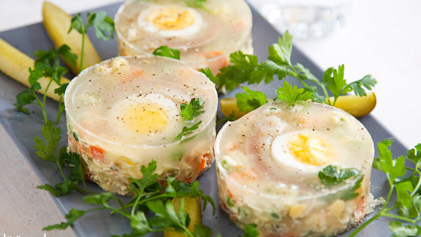 Zrób tak: ziemniaki, marchewkę i seler ugotuj w mundurkach, na ostanie trzy minuty dorzuć groszek, odcedź, ostudź, obierz i pokrój w kostkę (oczywiście z wyłączeniem groszku). Przełóż do miski, dodaj drobniutko posiekaną cebulę, korniszony pokrojone w kostkę i posiekaną pietruszkę, dopraw solą i pieprzem, następnie delikatnie połącz z majonezem. Żelatynę rozprowadź w około 0,7 litra osolonej wody według proporcji na opakowaniu, ostudź. Przygotuj indywidualne naczynia – najlepsze będą jednorazowe plastikowe pojemniki na żywność (najłatwiej później gotowe śledzie wyjąć). Na dnie każdego z nich wylej cienką warstwę galaretki, delikatnie wyłóż warstwę sałatki, zrób miejsce na środku, umieść w nim zwinięty kawałek śledzia, a w środek włóż połówkę jajka, zalej kolejną porcją galaretki tak, żeby wszystko przykryła, połóż po listu pietruszki i odstaw do lodówki na kilka godzin. W tym czasie smaki się przegryzą, a galaretka zetnie. Wyjmij z naczynek (aby było łatwiej, przejedź cienkim nożem wzdłuż obrzeży), podawaj na półmisku przybrane zieleniną i piklami.