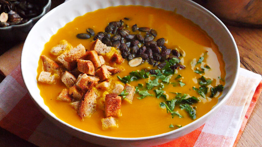 5. Dyniową podałem z uprażonymi pestkami dyni i grzankami.