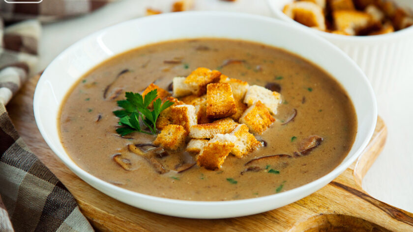 Restauracyjny przepis na kremową zupę grzybową z grzankami