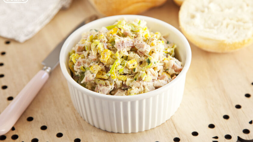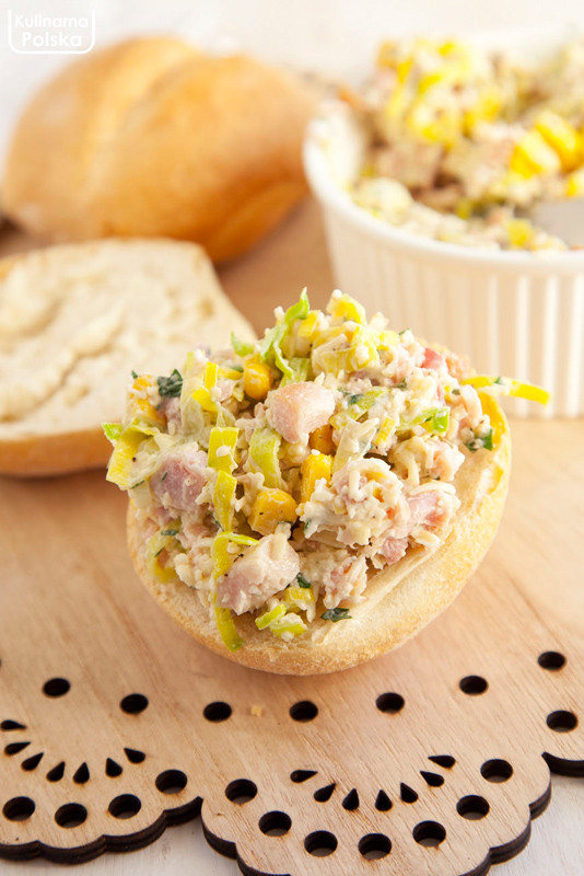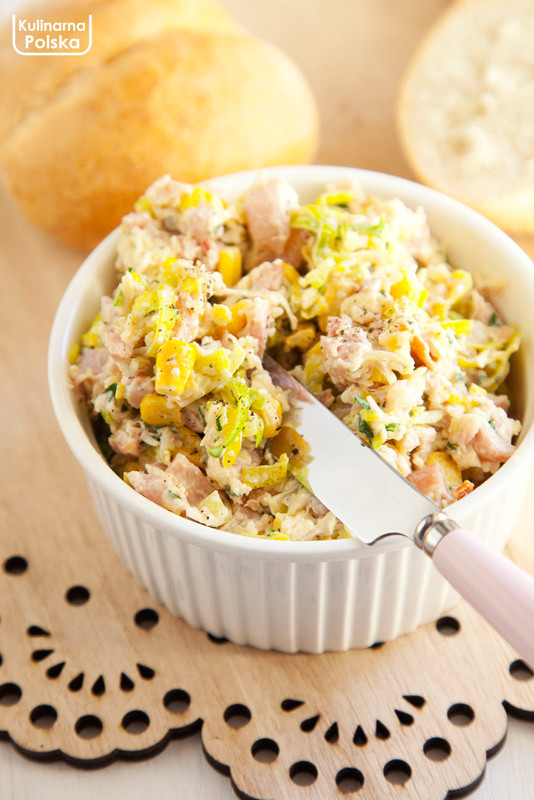 Składniki: średni por, 250 gramów żółtego sera, 2 ząbki czosnku, dwie wędzone ćwiartki z kurczaka (udka), pół puszki kukurydzy konserwowej, natka pietruszki, dwie czubate łyżki majonezu, sól, pieprz.