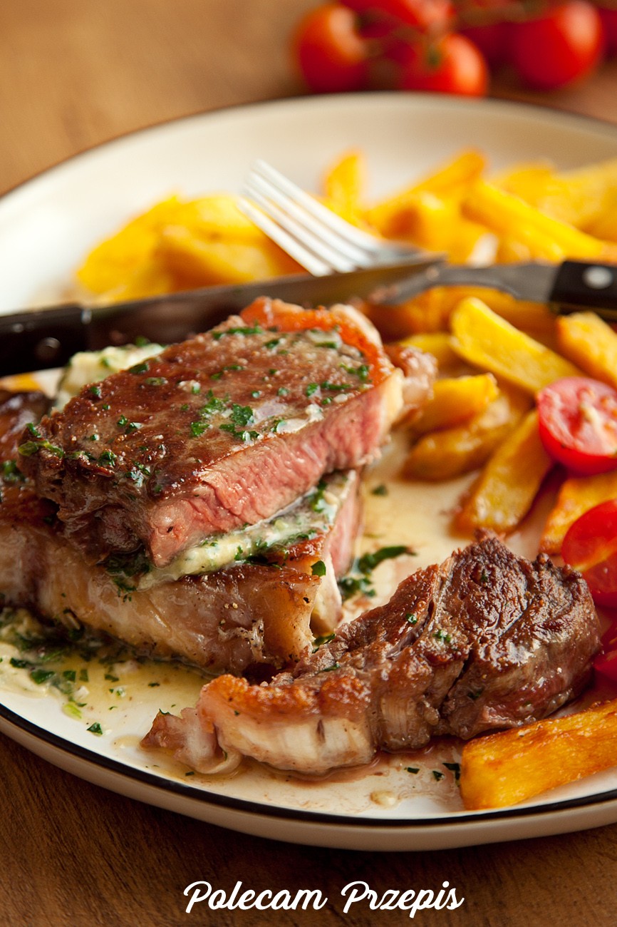 - Usmażony stek zdejmij z patelni, oprósz solą i pieprzem, połóż na nim masło czosnkowe, przed pokrojeniem odczekaj 3 minuty, aby soki w środku równomiernie się rozeszły.