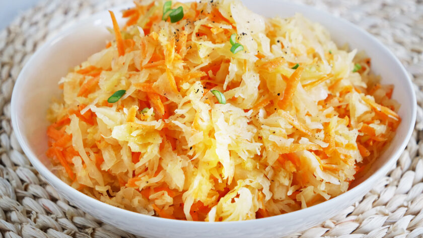 Składniki: 500 gramów kapusty kiszonej, 2 średnie marchewki, mała cebula, łyżeczka cukru, pieprz, 3 łyżki oleju.