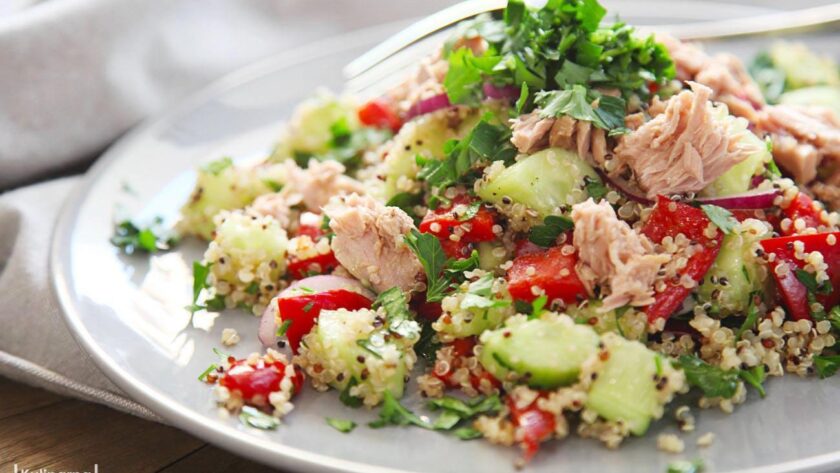 Bardzo lubimy takie sałatki – robi się je niezwykle łatwo i właściwie stanowią kompletny posiłek. Z komosą i tuńczykiem jest świetna na szybki lunch w szkole lub w pracy.