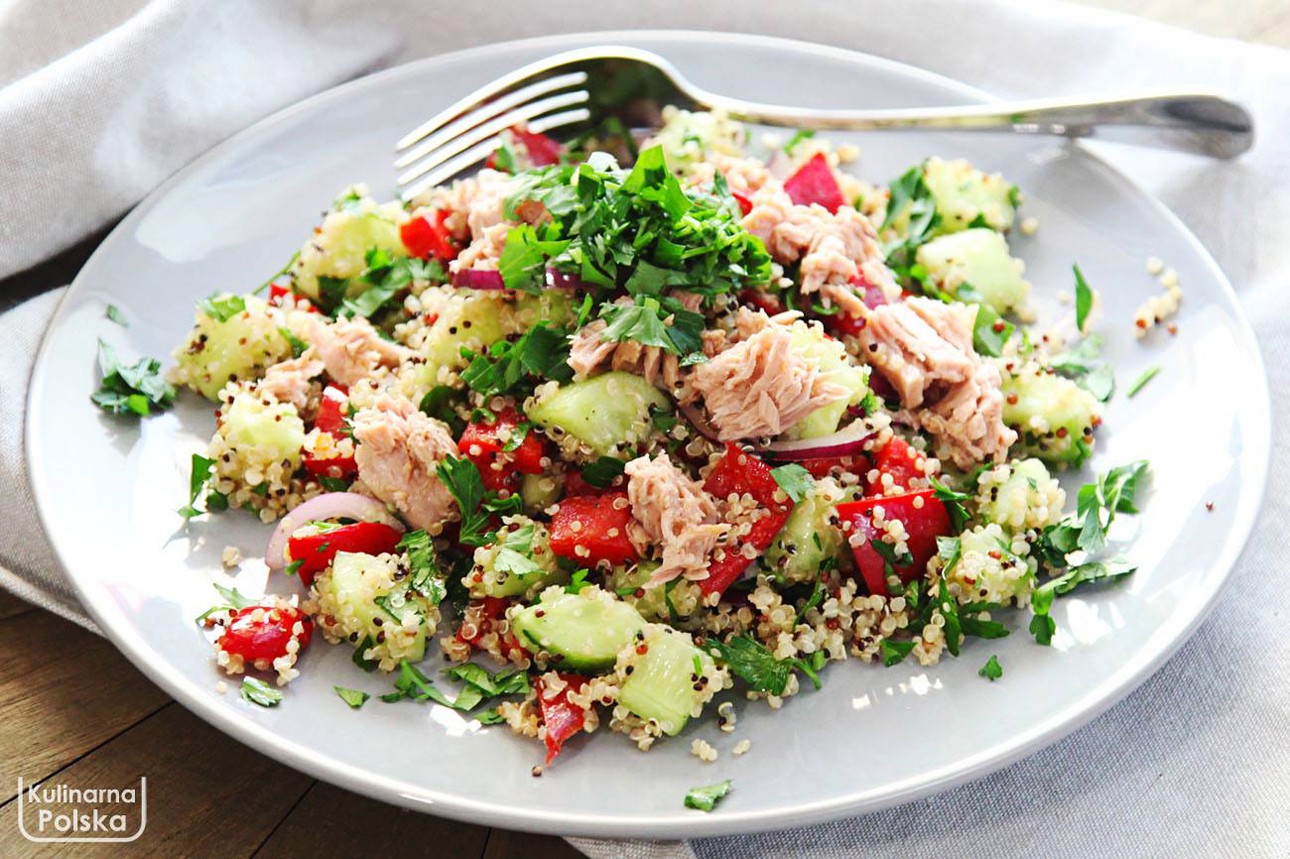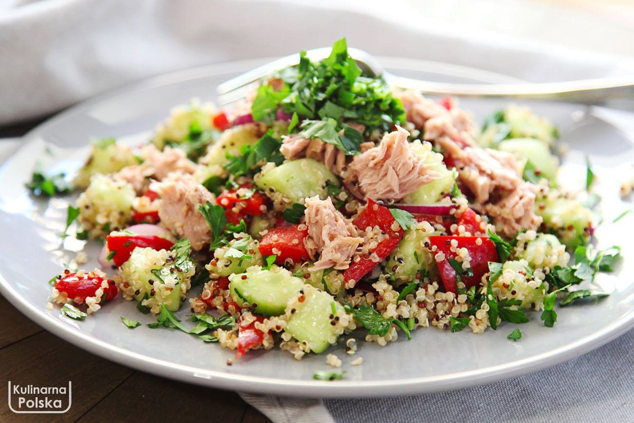 Zrób tak: komosę wypłucz w wodzie, następnie gotuj pod przykryciem w proporcji 1 część kaszy do 1 i 3/4 części wody przez około 12 min., wyłącz ogień i odstaw bez odkrywania na około 10 minut. Cebulę pokrój w cienkie pióra, ogórka i paprykę w kostkę. Natkę posiekaj. Warzywa wymieszaj z przestudzoną komosą i połową tuńczyka razem z olejem. Dopraw solą i pieprzem. Resztę ryby wyłóż na każdą z porcji. Tak przygotowaną sałatkę można przechowywać nawet przez kilka godzin, dlatego dobrze sprawdza się jako danie pudełkowe.