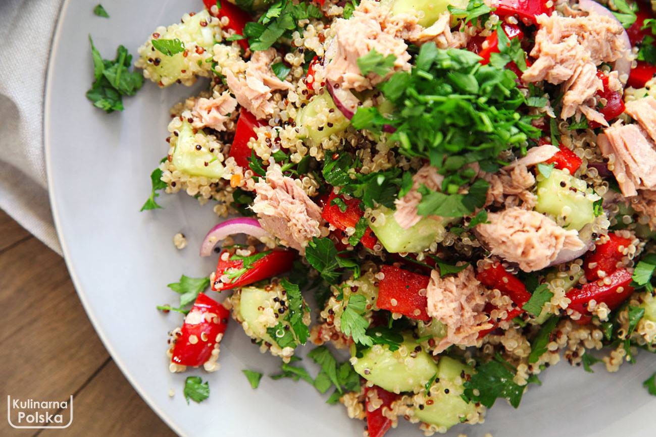 Składniki: 100 gramów komosy ryżowej, mała czerwona cebula, papryka czerwona, ogórek, natka pietruszki, dobrej jakości tuńczyk w puszce (kawałki w oleju), sól, pieprz.