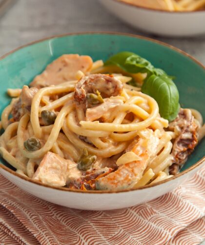 Kawałki zrumienionego łososia zatopione w kremowym sosie razem z suszonymi pomidorami. To jest po prostu przepyszne. Przepis na makaron z łososiem i suszonymi pomidorami Składniki: …