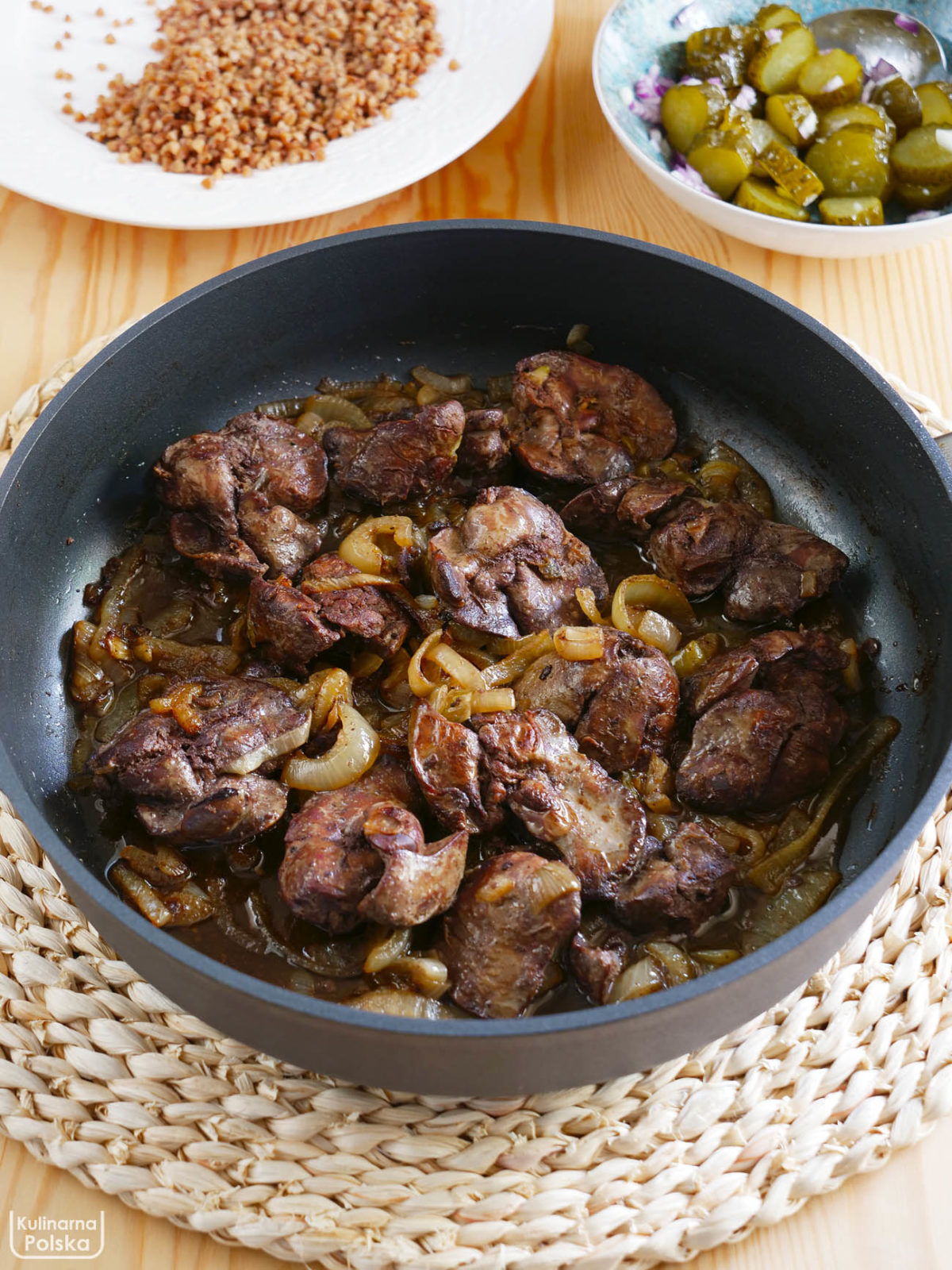 Składniki: 500 gramów wątróbki z kurczaka, 2 duże cebule, olej, sól, pieprz.