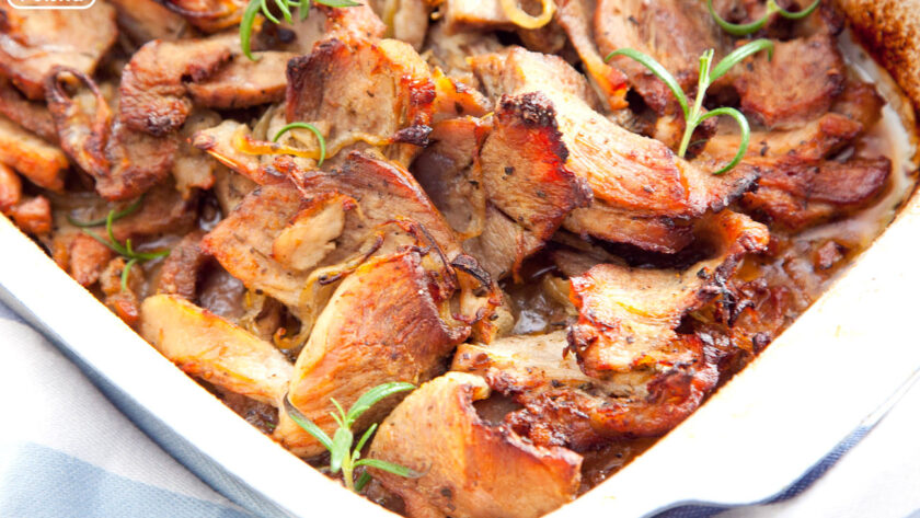 Składniki: około kilogramowy kawałek karkówki lub łopatki wieprzowej, 5 ząbków czosnku, 2 cebule, sól, pieprz, oregano suszone, oliwa.