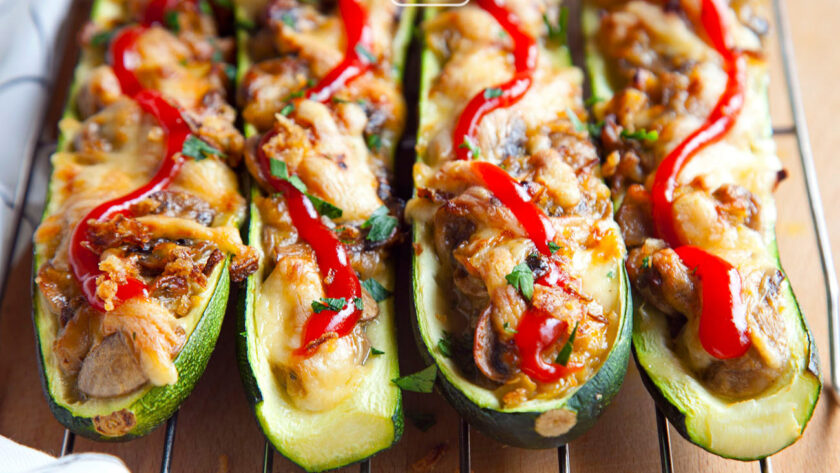 Zrób tak: cebulę i czosnek drobno posiekaj i przesmaż na oleju razem z pokrojonymi w cienkie plastry pieczarkami. Z cukinii odetnij końcówki, przekrój wzdłuż i za pomocą łyżeczki wydrąż miąższ – ostrożnie, żeby nie naruszyć skórki. Drobno go posiekaj i dodaj do pieczarek, następnie wszystko razem delikatnie zrumień. Na koniec dodaj połowę startego sera, dokładnie wymieszaj. Farszem wypełnij cukinię, posyp resztą sera, zapiekaj w temp. 180 stopni około 40 minut. Podawaj z dodatkiem ketchupu.
